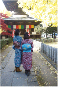 「まつりは参加すべし」の、モノプランの精神で、女性スタッフが足利銘仙を着て散策開始です。まずは、食欲の秋ということで、あしかがフラワーパークで開催されているグルメグランプリへ。